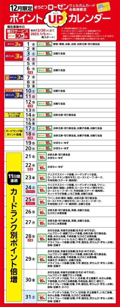 12月ポイントUPカレンダー 投稿公開日:12月 16, 2022 お探しの商品がポイント10倍で買えるチャンス♪カレンダーをチェックしてお得にポイントを貯めましょう!※詳しくは画像をクリックして下さい おすすめ 【ウェルカムカード会員様限定】年末大感謝祭!! 12月 16, 2022